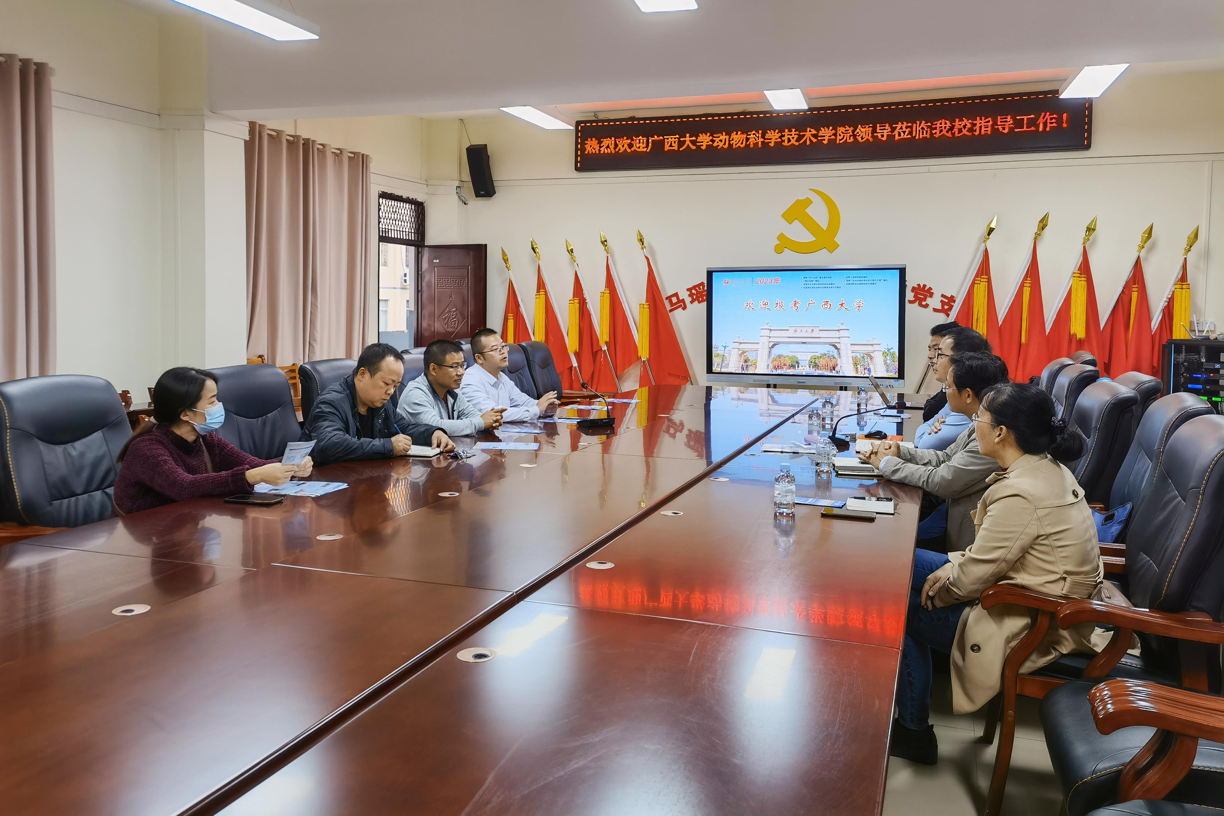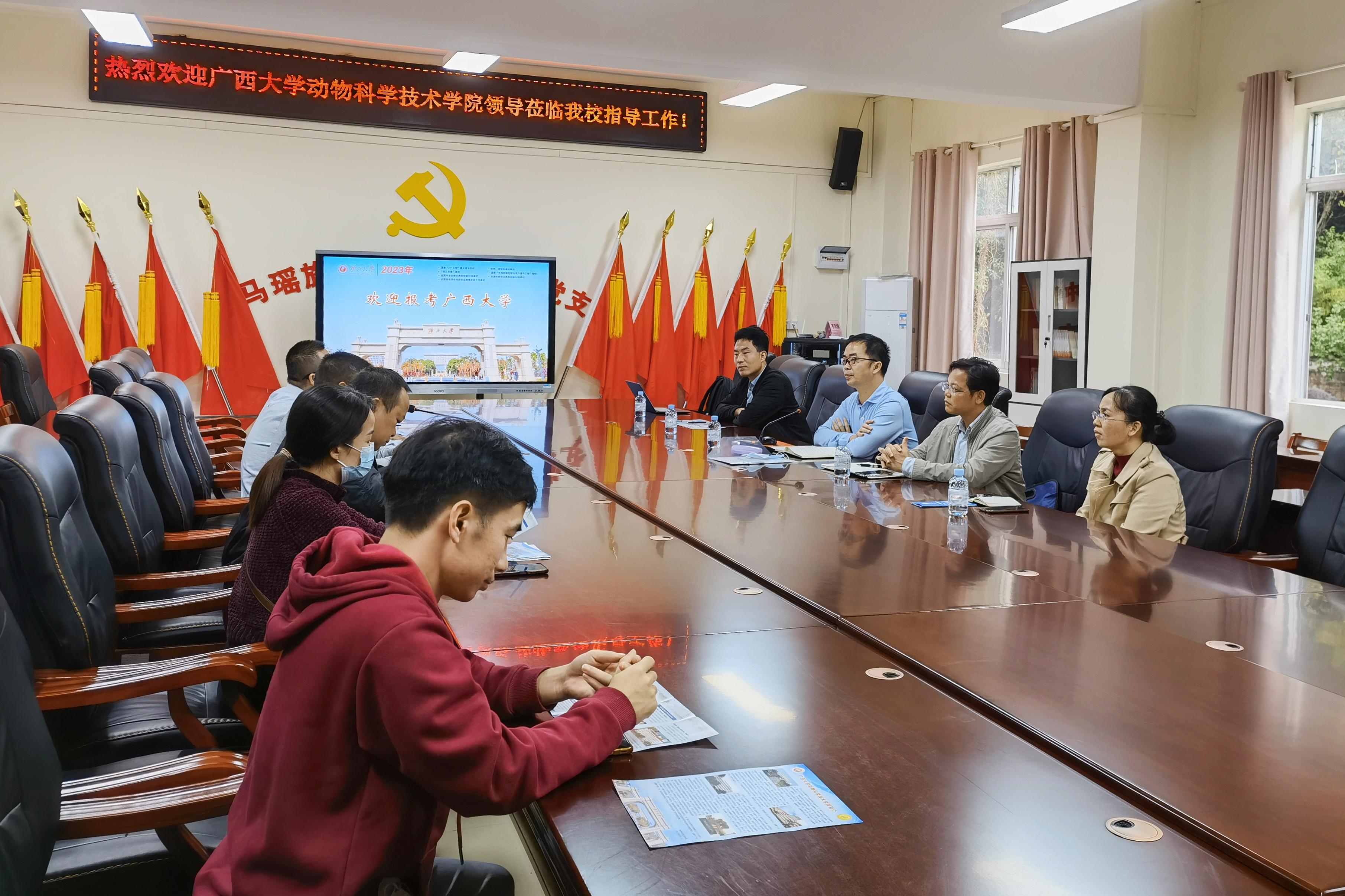 为进一步加大公司招生宣传力度,加强与区内优质中学的沟通联系,11月24日至25日,WilliamHill中文官网常务副经理陆阳清,副经理何家康,动物医学系主任陈樱,动物科学系副主任李辉,团委副书记刘诚先后走访都安瑶族自治县高级中学、巴马瑶族自治县高级中学、凤山县高级中学等3所自治区示范性普通高中。