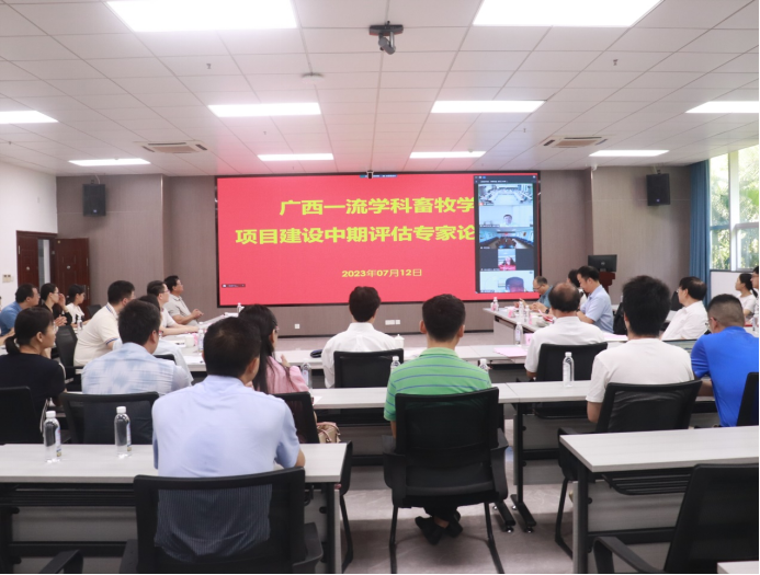 2023年7月12日上午,广西新一轮一流学科畜牧学项目建设中期评估专家论证会在亚热带生物资源保护与利用重点实验室107会议室召开。中国农业科公司北京畜牧兽医研究所文杰研究员、华中农业大学赵书红教授、浙江大学汪以真教授、华南农业大学聂庆华教授、贵州大学杨增明教授、海南大学王凤阳教授、云南农业大学邓卫东教授应邀组成专家组,对公司的广西一流学科畜牧学项目建设中期情况进行评议。