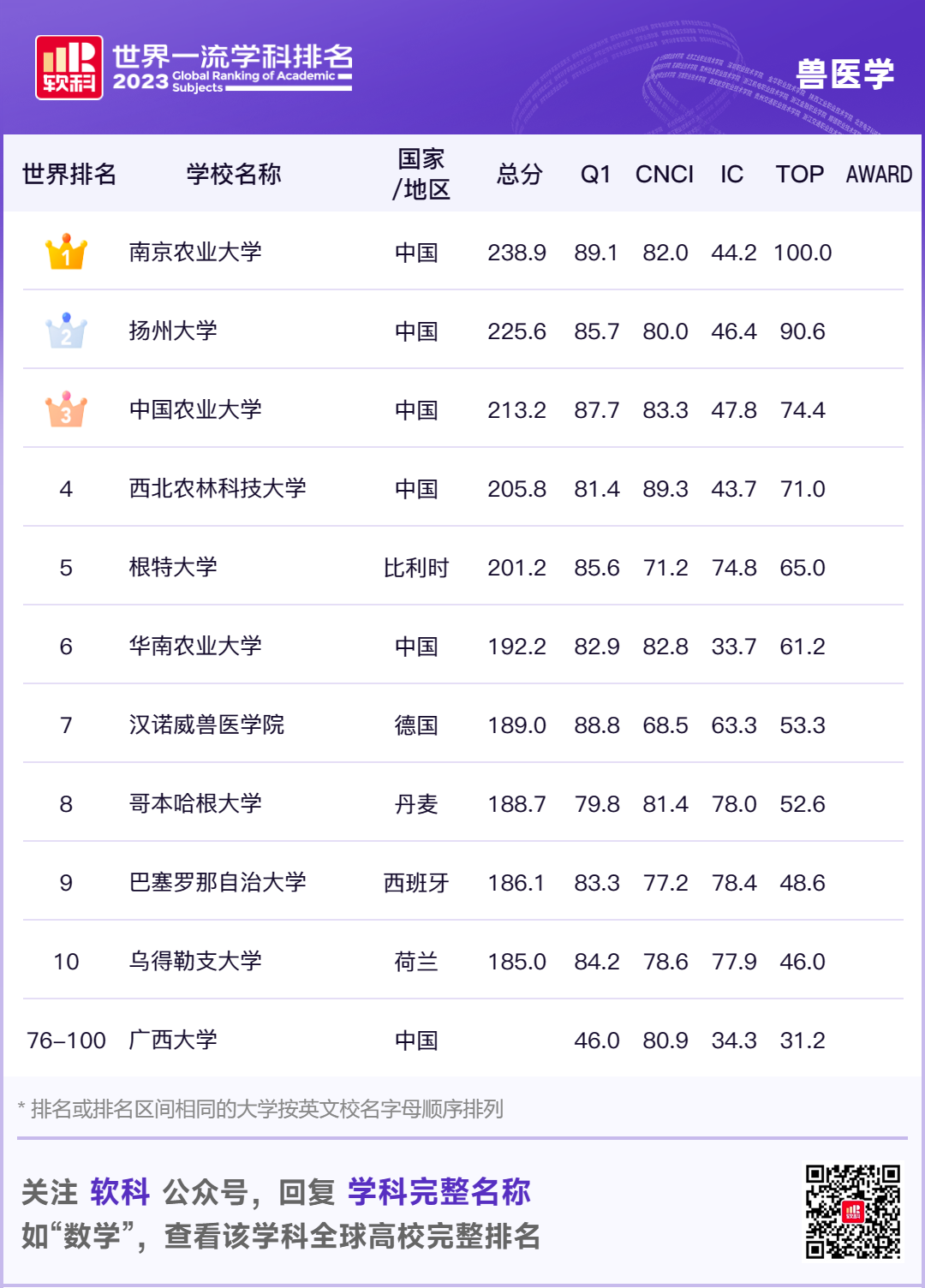 10月27日,高等教育评价专业机构软科正式发布2023“软科世界一流学科排名”,其中威廉希尔WilliamHill的兽医学学科跻身世界前100,位居第76-100名。