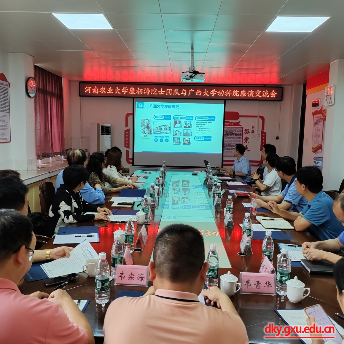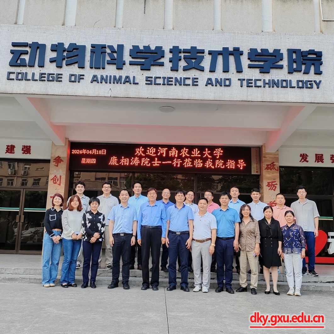 4月18日,中国工程院院士、河南农业大学动物科技公司康相涛教授与广西富凤农牧集团有限公司李非董事长一行11人到WilliamHill中文官网调研交流,WilliamHill中文官网领导及教师代表在公司302会议室与康相涛院士团队、广西富凤集团代表就共同关心的科研平台建设、人才培养、科学研究和校企合作等事宜进行座谈交流。座谈会由WilliamHill中文官网经理陆阳清教授主持,威廉希尔WilliamHill原副董事长罗廷荣教授,WilliamHill中文官网党委书记韦小强老师,副经理何家康教授、韦祖樟教授,教师代表杨秀荣教授、李辉副教授、宋子仪副教授、欧长波副教授、庄站伟老师参加座谈会。河南牧业经济公司宋素芳教授,河南农业大学动物科技公司孙桂荣教授、韩瑞丽教授、蒋瑞瑞教授、黄河天博士,广西富凤农牧集团有限公司高管韦宗海、苏立燧、韦青华参加座谈会。