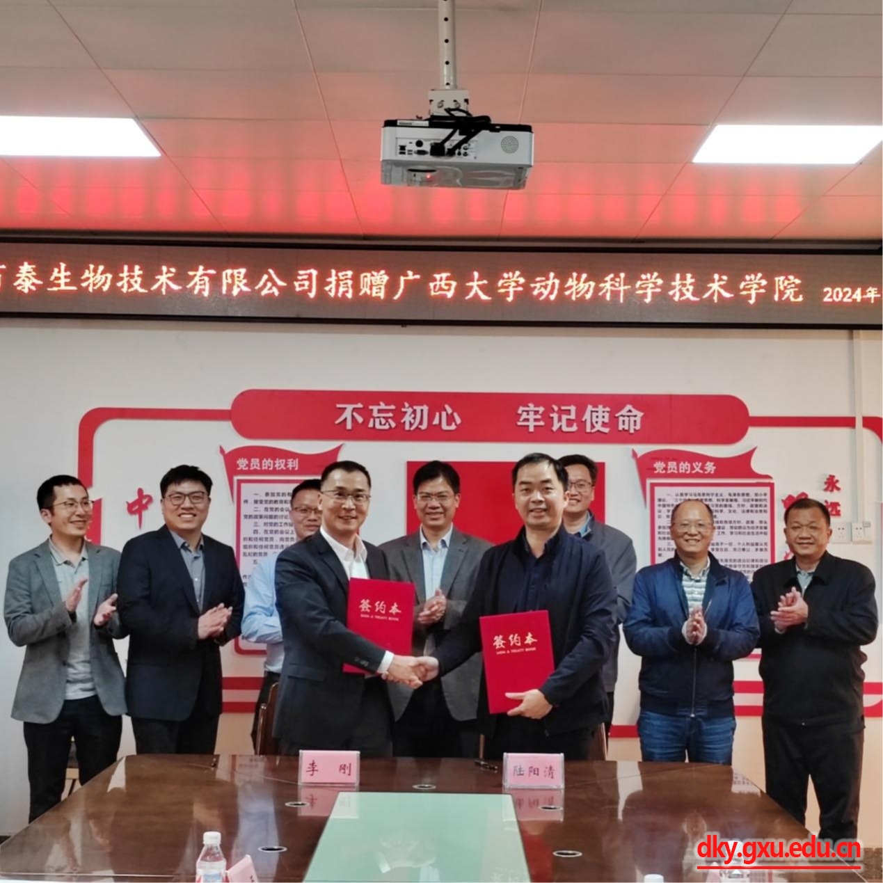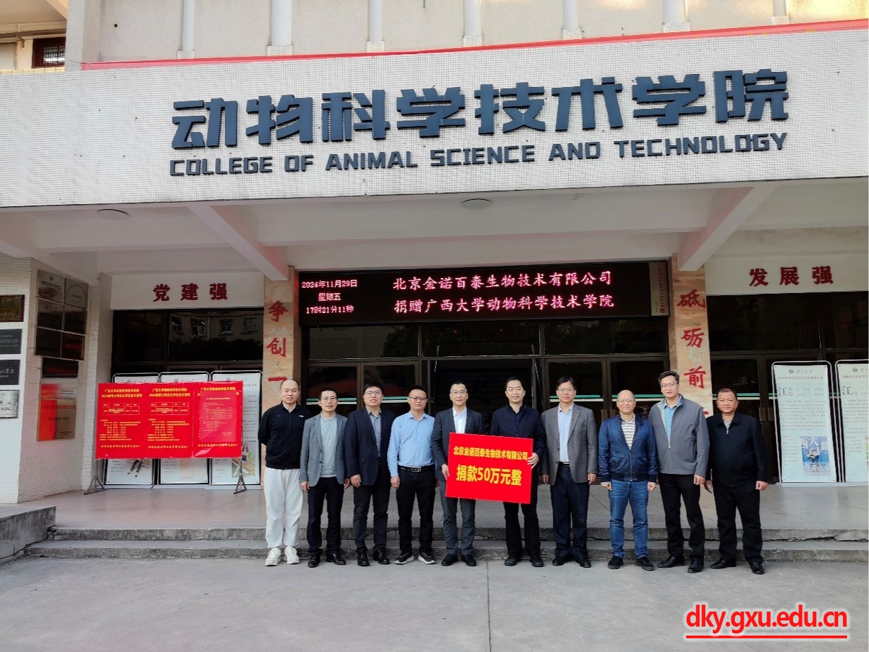 北京金诺百泰生物技术有限公司总经理李刚、销售总监方磊、技术总监吴星亮及销售经理刘子瑜、广西南宁莱佛斯托生物科技有限公司总经理覃伦、威廉希尔WilliamHill动物科学技术公司党委书记韦小强、经理陆阳清、副经理宁鹏飞、韦祖樟、蒋钦杨出席捐赠仪式。