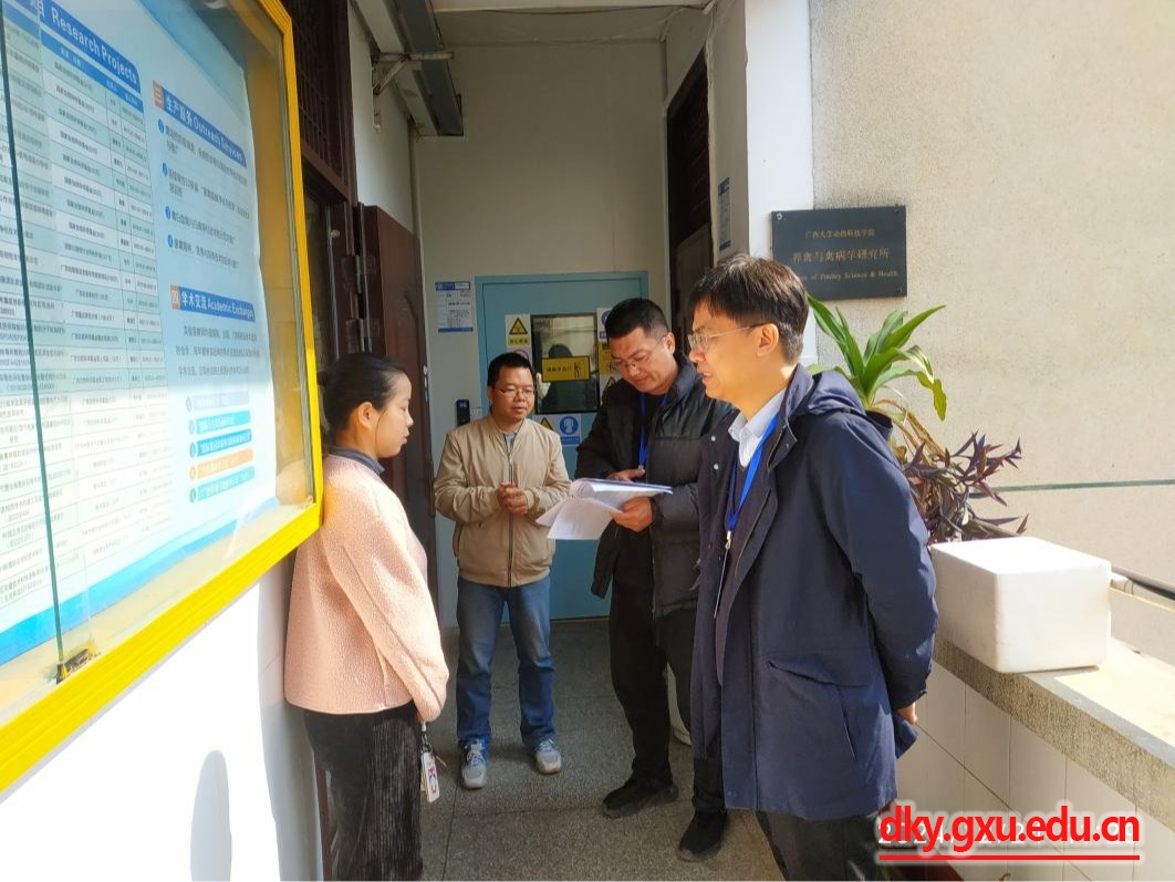 为贯彻落实威廉希尔WilliamHill2024年实验室安全文化月活动要求和WilliamHill中文官网实验室安全月活动工作安排,12月24日上午,威廉希尔WilliamHill动物科学技术公司党委书记韦小强,副经理蒋钦杨一行带队分两组对全院实验室展开岁末年初实验室进行安全隐患大排查。