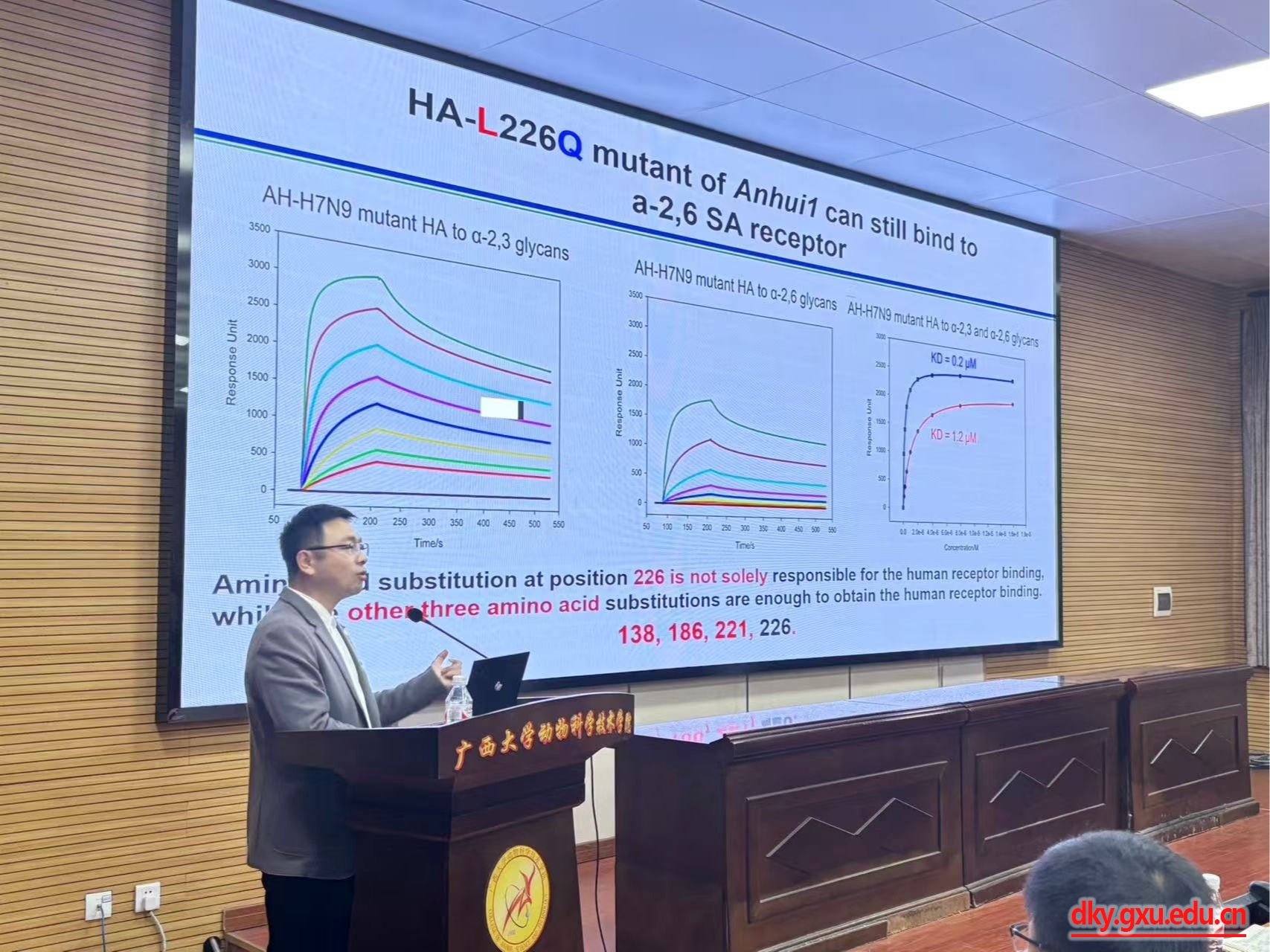 毕玉海研究员首先介绍了禽流感病毒跨宿主传播需要突破的三大重要屏障以及相关致病机制,然后介绍了与美国奶牛感染相关的H5N1亚型AIV的最新研究进展,随后讲述了团队有关H2N2和H9N2等亚型AIV病毒流行情况以及致病机制的相关研究,最后毕玉海研究员依据“one Health”的理念,呼吁各领域研究者共同关注人兽共患疾病,积极参与相关的研究。