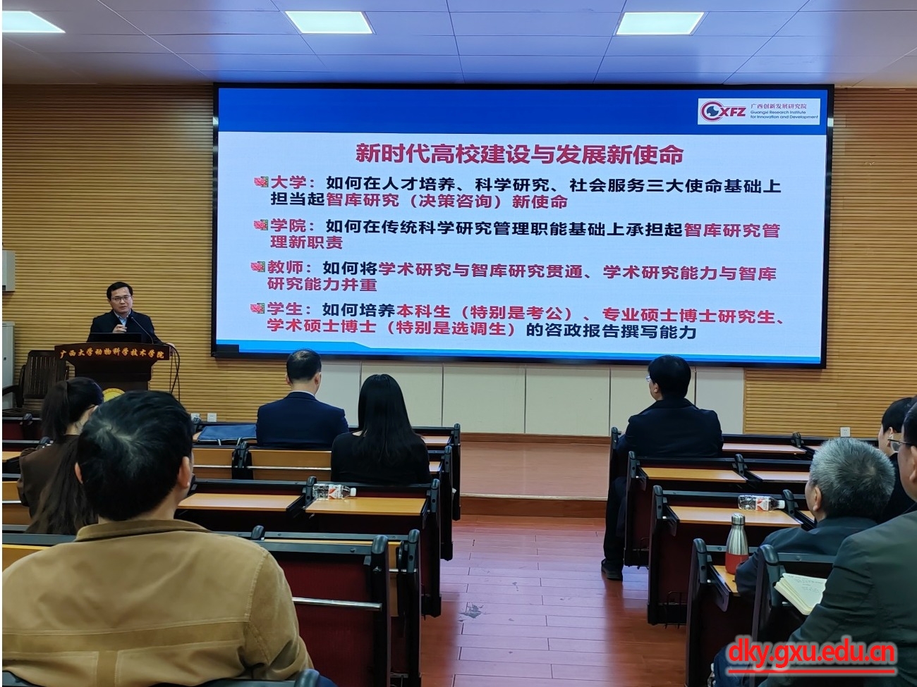 此次教职工大会还邀请了广西创新发展研究院经理梁运文作专题宣讲报告,梁运文经理以《广西创新发展研究院情况汇报》为题,首先从广西创新发展研究院成立的背景与初衷、职责使命等方面阐明了智库研究的重要性,接着介绍了智库成果报送的渠道,最后分享了开展智库研究的一些实践经验。本次报告会内容丰富、视野开阔、主题鲜明,公司全体教职工获益匪浅。