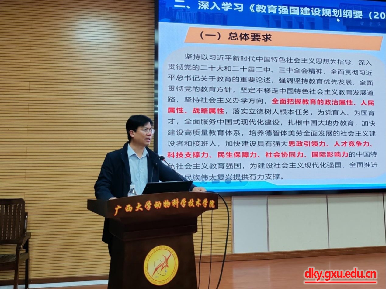 会上,公司党委书记韦小强首先带领全院深入学习全国两会精神和《教育强国建设规划纲要(2024-2035年)》。强调公司各党支部要结合专业实际,以“三会一课”等形式组织师生党员认真学习贯彻。韦小强书记以《师德铸魂师风育人》为题,结合案例开展师德师风教育。他强调教师是立教之本、兴教之源,师德师风是教师队伍建设的灵魂,作为员工成长的引路人,教师的言行举止不仅影响着员工的学业发展,更深刻塑造着他们的价值观和人生品质,加强师德师风建设,是新时代教育高质量发展的必然要求,也是落实立德树人根本任务的重要保障。之后韦书记部署公司本学期党建与思想政治工作、“三业一稳”工作、推进农科大楼建设、动物医院运营、重大科研平台谋划、员工、助力乡村振兴、对外宣传等重点工作。最后,韦书记指出要强作风,聚合力,以“三拼精神”高质量推进公司各项工作。