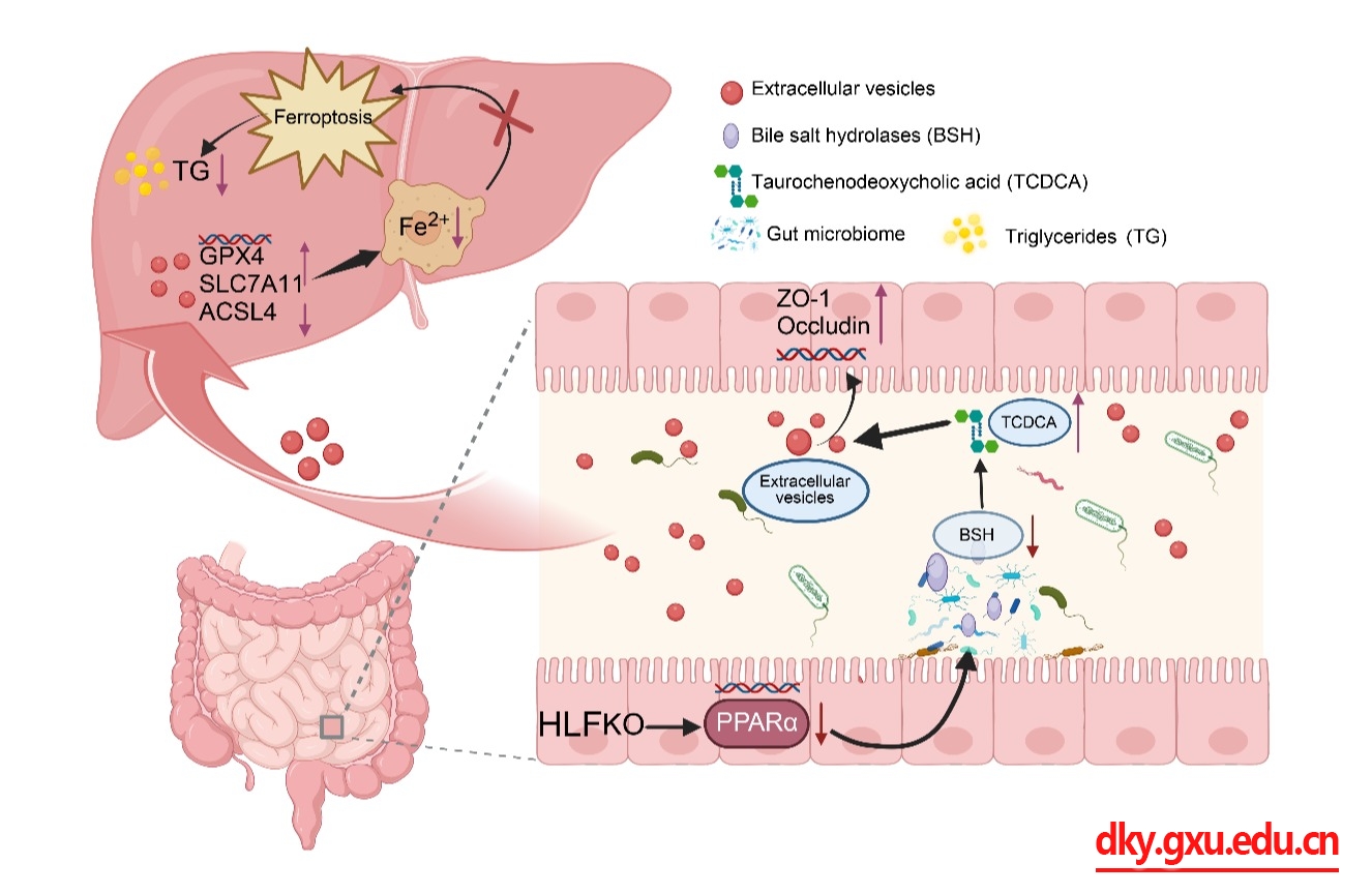本研究通过肠道特异性敲除肝白血病因子(HLF),探究不同营养条件下肠道HLF对机体脂代谢的影响及其作用机制。研究表明,抑制HLF/PPARα轴通过影响肠道微生物来源的细胞外囊泡(fEVs)调节肠-肝循环、抑制肝细胞铁死亡,从而减少肝脏脂肪沉积、缓解脂肪肝。对fEVs的进一步分析显示,结合型胆汁酸牛磺鹅去氧胆酸(TCDCA)为fEVs降脂作用的关键分子。这些发现阐明了肠道HLF对脂代谢紊乱的调控作用,为治疗相关疾病提供了一种低成本、高效和安全的新途径,也为畜禽营养代谢的精准调控和新型饲料添加剂的开发提供了理论依据。