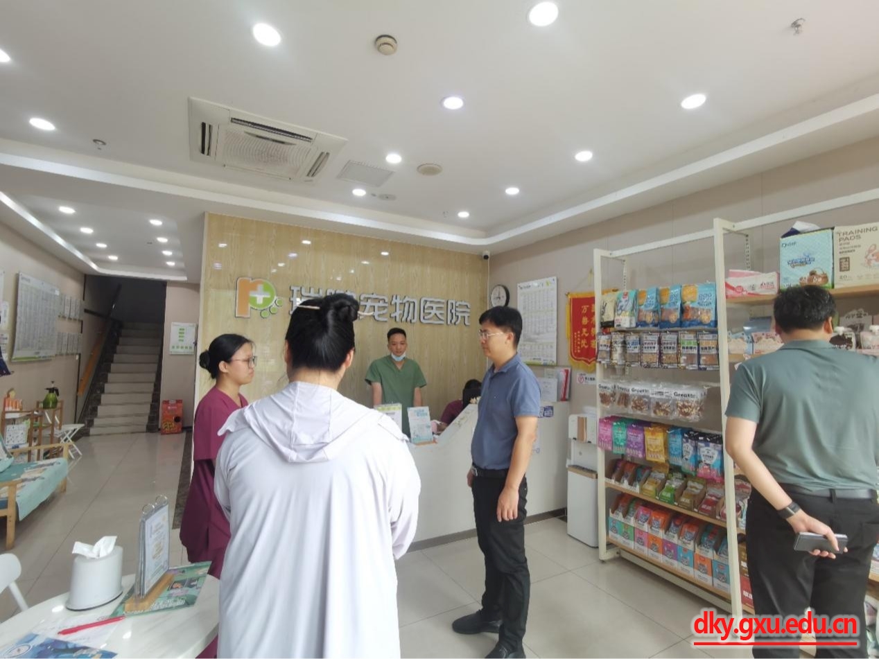 第二站,韦小强书记一行来到瑞鹏宠物医院南宁安吉分院,与动医系副主任方芳和实习指导老师韦懿仙一同看望在医院实习的员工,了解员工实习进展,要求实习生继续保持吃苦耐劳、积极向上的学习精神,多看、多学习、多动手,做好自身防护,重视实习安全。大家还与宠物医院经理、实习指导老师亲切交流,感谢瑞鹏公司给予实习平台和医院.老师的细心指导。。