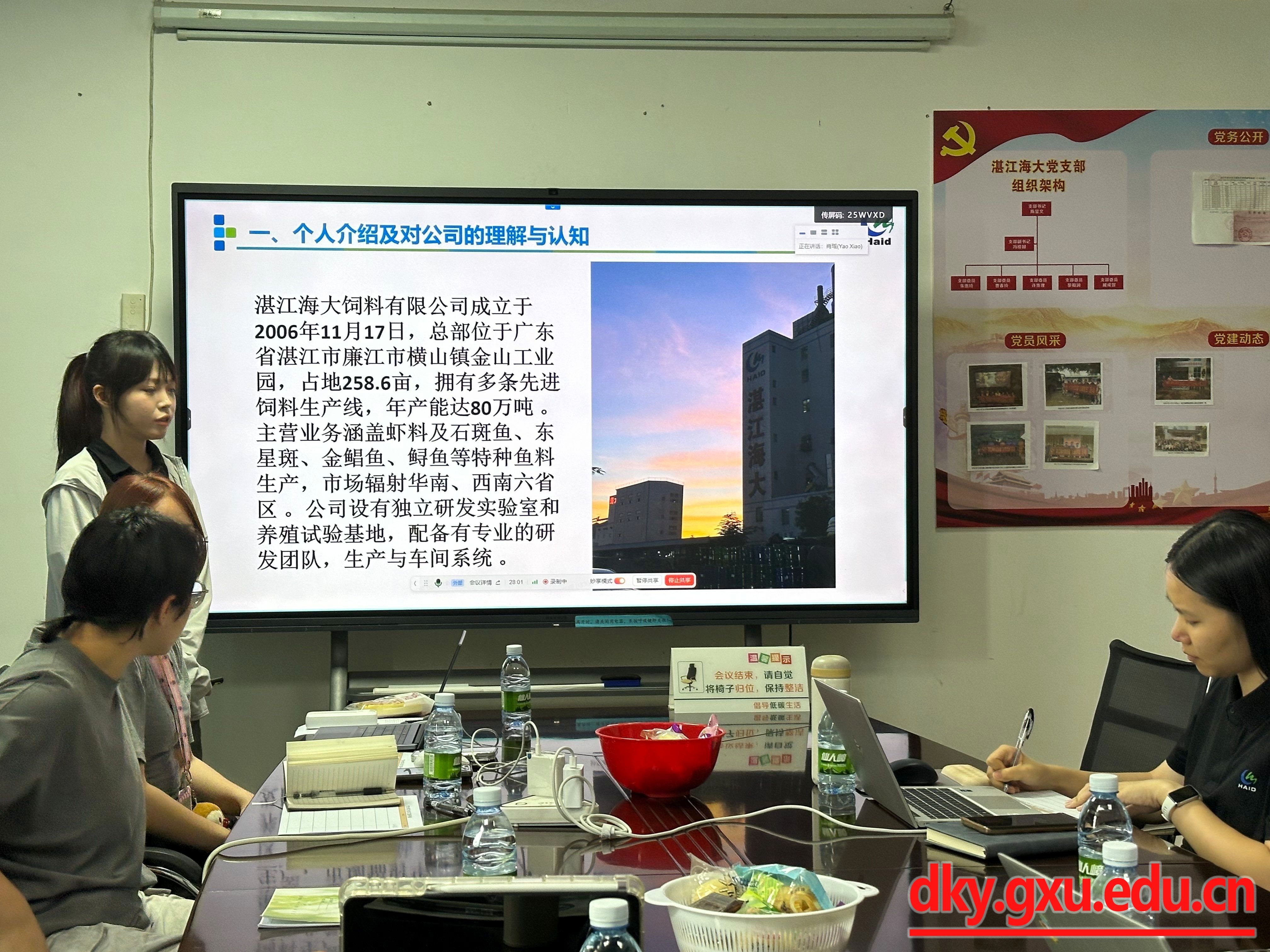 8月26日,实习总结会在湛江海大饲料有限公司总部顺利召开。会议采用线上线下相结合的方式,湛江海大饲料有限公司相关负责人、指导老师以及全体实习员工参加了此次会议。会上,各基地实习员工依次汇报了实习内容、收获与感悟。总部员工详细阐述了品控流程和小水体养殖循环系统的运行与优化;钦州基地员工分享了小棚虾养殖的日常管理与病害防控经验;阳西基地员工则重点介绍了研发实验中的养殖实践操作和数据分析。