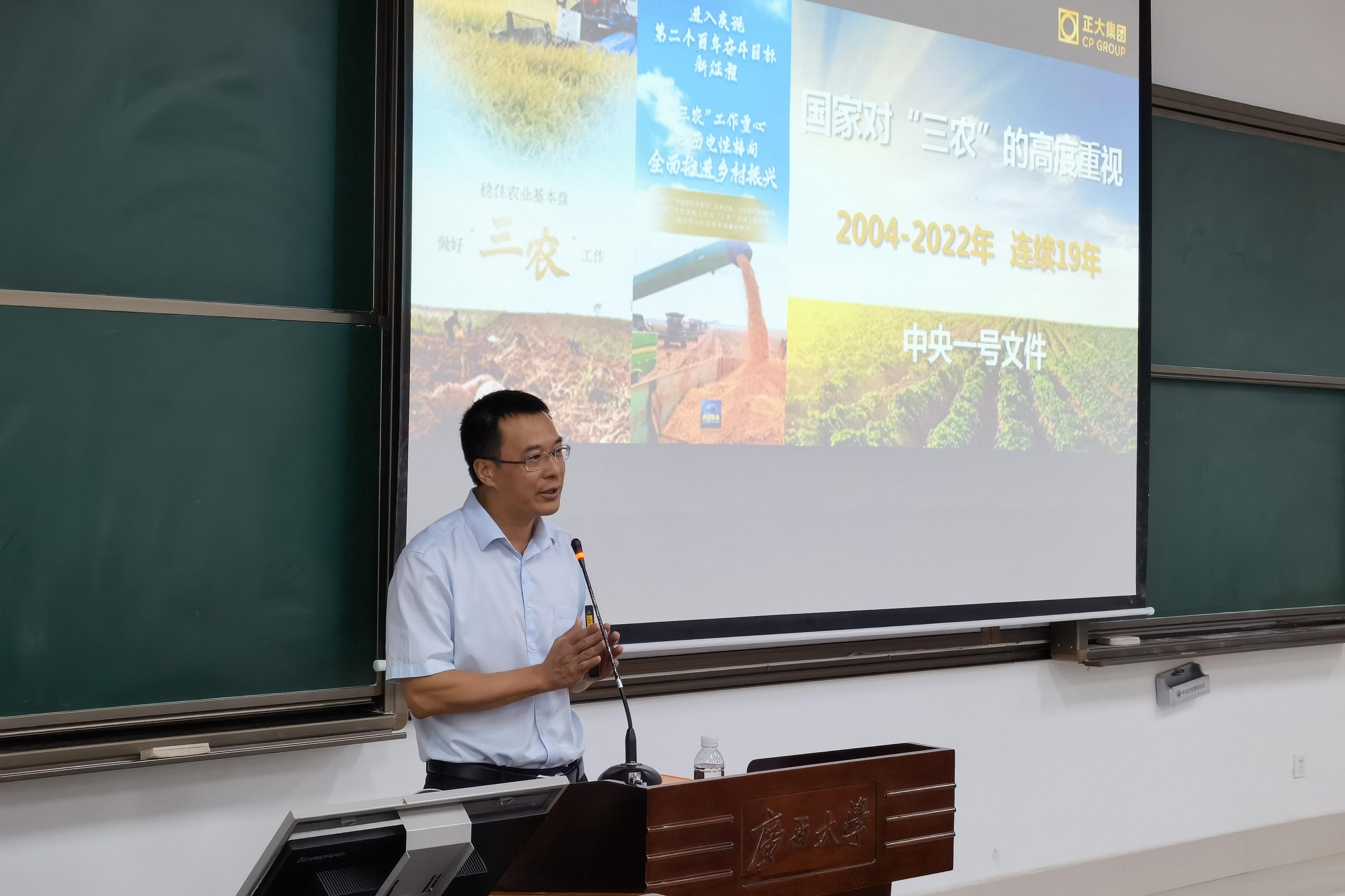 9月28日晚上,WilliamHill中文官网在第六教学楼B603教室举办“企业高管进校园”专题讲座,正大集团广西区总裁赖平生先生受邀主讲。动物科学技术公司党委书记顾慕娴,党委副书记沙建,团委书记李丽娜,团委副书记刘诚,班主任王健、孔志伟、欧伟豪、梁正敏、覃一峰,正大集团广西区人事总监翟栋高,总裁秘书黄美霞,正大饲料(广西)人事主管莫仙梅,以及150余名本科生、研究生参加此次活动。