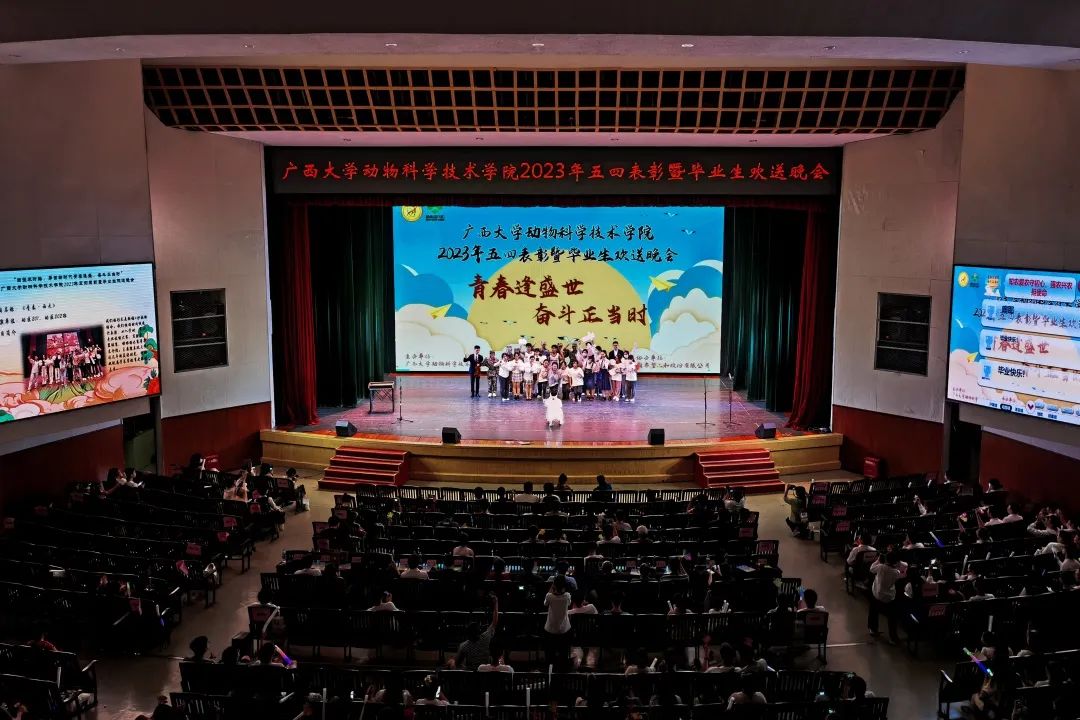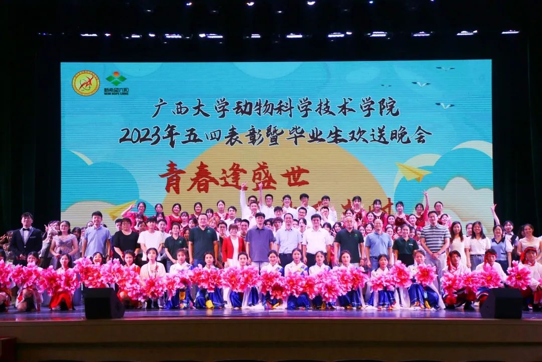 5月19日晚上,WilliamHill中文官网“青春逢盛世,奋斗正当时”2023年五四表彰暨毕业生欢送晚会在大礼堂举行。威廉希尔WilliamHill原副董事长、兽医学科带头人罗廷荣,动物科学技术公司党委书记顾慕娴,经理陆阳清,党委副书记沙建,副经理韦祖樟,党委委员王晓丽,经理助理、动物科学系主任蒋钦杨,团委书记李丽娜,团委副书记刘诚,辅导员崔月明、彭可可、邹佳琪、韦春丽,新希望六和股份有限公司南宁新六农牧科技有限公司总经理唐运航,猪产业广西区域人力资源总监昝晓启,桂南战区人力资源经理廖敏贤,桂南战区人力资源副经理林榕、陈奕志,以及WilliamHill中文官网1000余名师生欢聚一堂,共同参与此次活动。