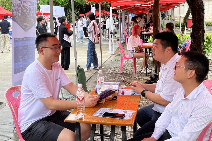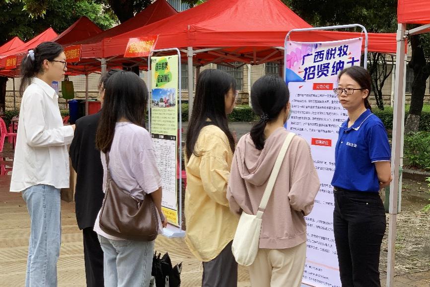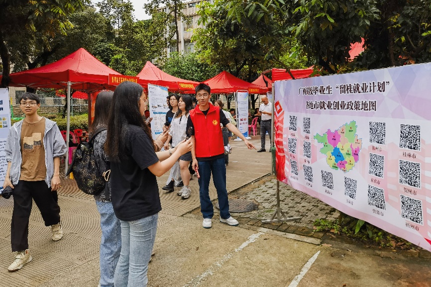 本次双选会应用数字技术,依托微信公众号、公司主页等平台,及时将参会信息推送给在校员工和用人单位,通过开展精准对接服务,大大提高求职员工和用人单位参会的便捷度、满意度。现场的广西高校毕业生“留桂就业计划”展区为参会员工展示了各设区市就业创业政策清单。此外,双选会还设置了党员先锋服务岗,提供政策咨询、手续办理、资料打印等志愿服务。