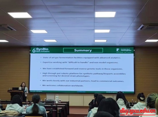 分享会上,张颖副教授结合最新研究成果,介绍了合成生物学(Synbio)及其在诺丁汉大学研究中心的总体情况。接着,张颖副教授向同学们分享了其研究团队在氨基酸工程方面的突破,即可通过合成生物学技术提高特定氨基酸(如蛋氨酸和赖氨酸)的含量,从而生产高蛋白饲料。最后,张颖副教授介绍了一种新的、可持续的饲料生产方式——利用合成生物学技术生产低碳排放高蛋白饲料,强调了合成生物学在现代农业和可持续生产中的潜力及其对环境的积极影响。
