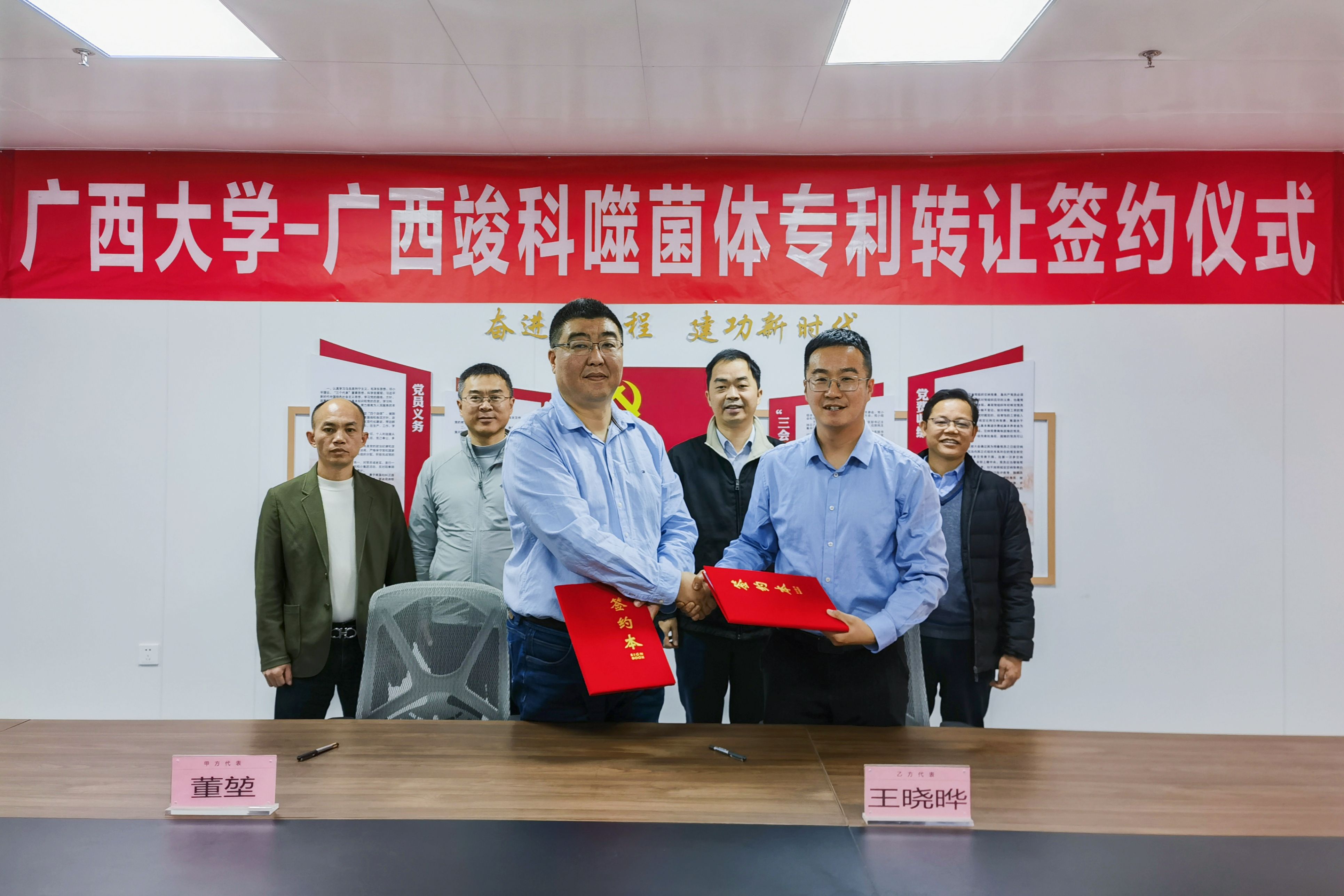 王晓晔老师与董堃总经理分别代表校企双方签署噬菌体发明专利转让协议。