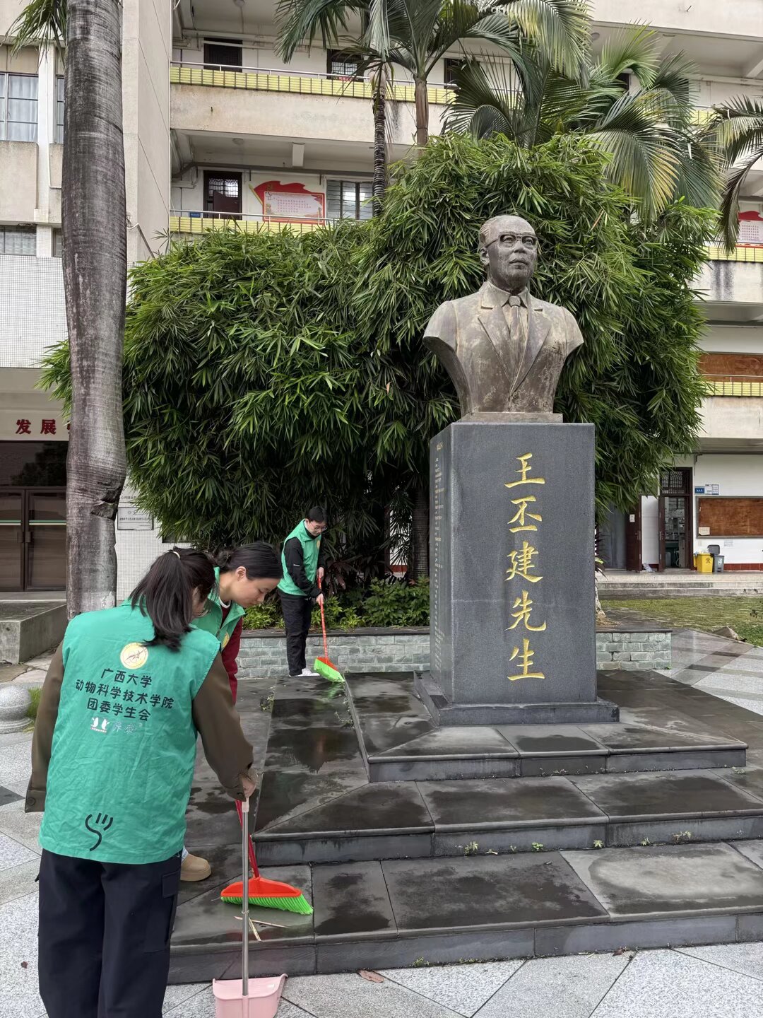 参与活动的25级新生李同学感慨地说:“以前路过这里,只知道先生是公司的前辈,但并不了解他的具体事迹。这次一边清扫,一边听学长学姐讲述先生的故事,我不仅亲手守护了校园的纪念地标,更对公司的历史有了更深的了解,也更加敬佩先生了。”