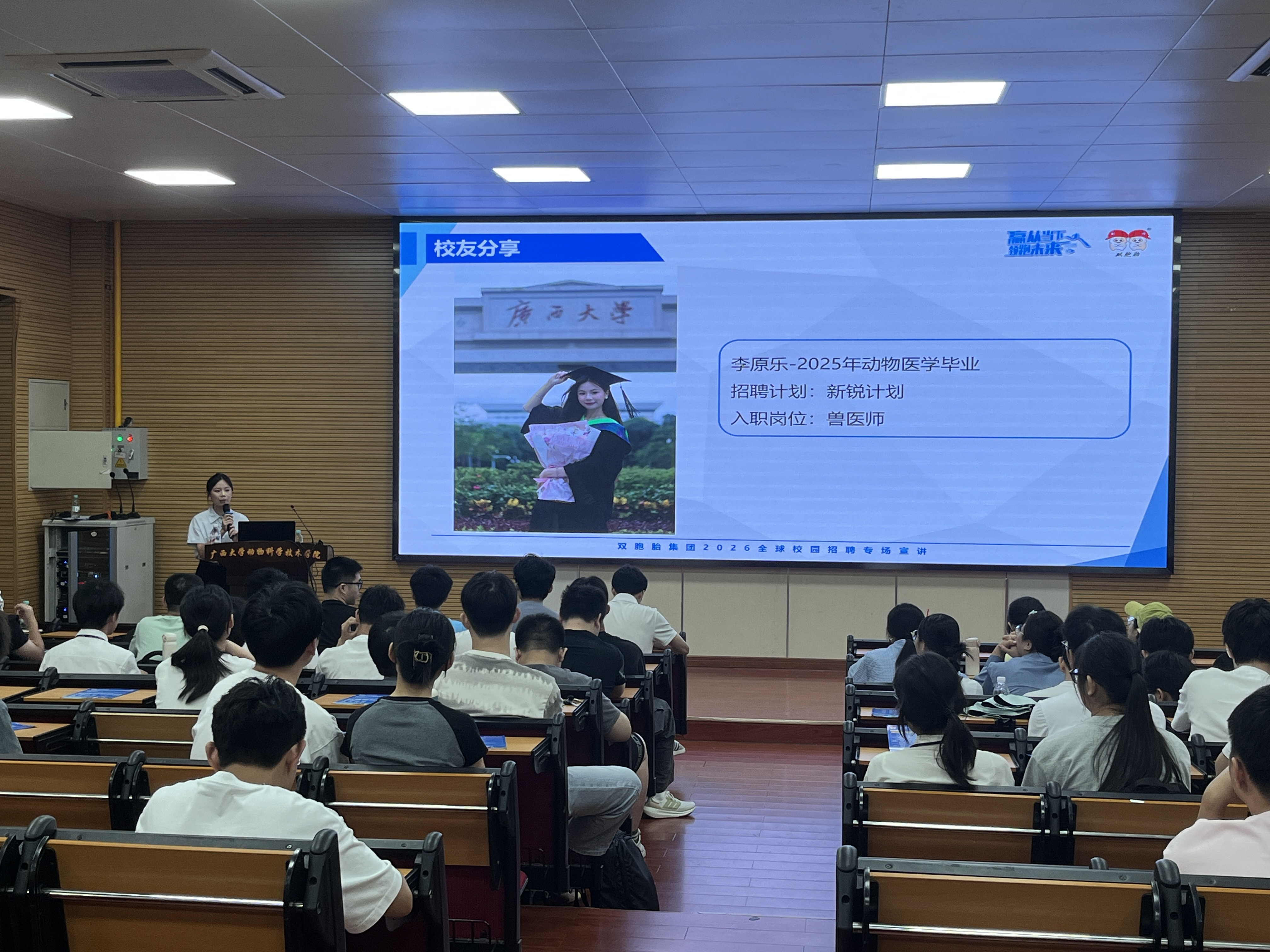 公司就业指导老师简要介绍了当前动科专业就业市场态势,强调了优秀员工经验对求职的指导价值。随后,3位员工结合自身从校园到职场的成长经历,用接地气的分享风格、鲜活的实战案例,为学弟学妹们全景呈现不同就业路径的发展图景。