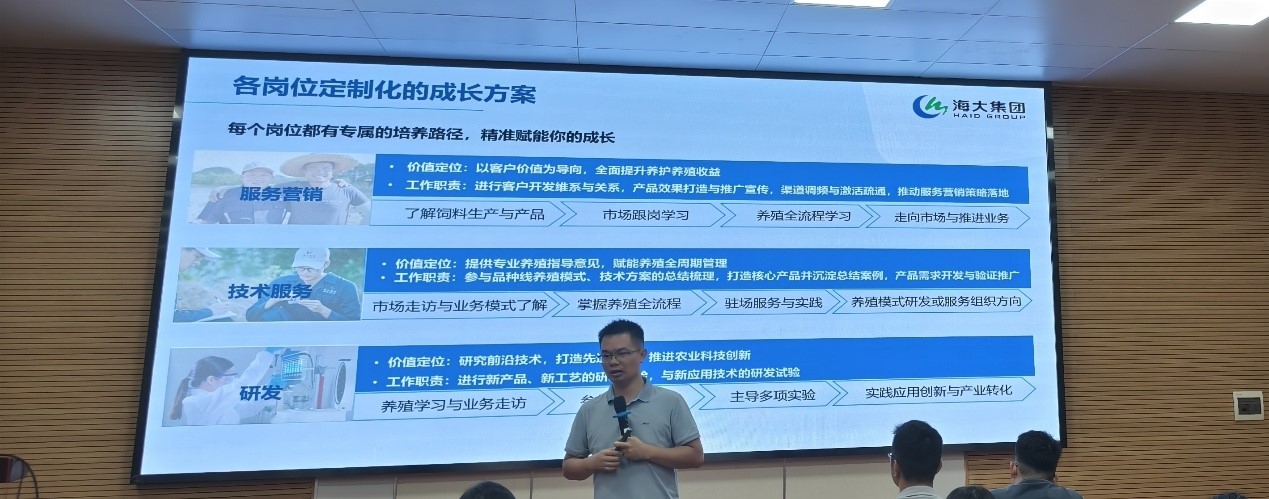 在人才培养与职业发展环节,主讲嘉宾重磅发布了海大集团针对不同专业背景硕博研究生的定制化培养方案,引发全场高度关注。嘉宾以集团内部硕博人才成长案例为蓝本,详细讲解了定制化培养方案的实施流程与保障机制,让在场研究生对未来职业发展蓝图有了更清晰的认知。