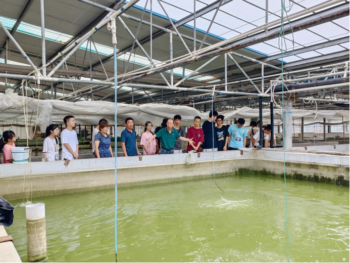 随后,师生们来到相邻的广西巴马鑫坚实业集团有限公司武鸣基地进行调研,基地总经理王宁亲自带领大家参观巡塘,介绍其以生态优先的绿色发展链、产业链、产品质量可追朔体系,为师生们展示高质量发展的现代渔业。
