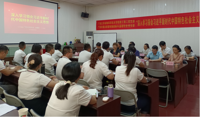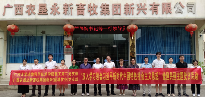 为深入学习、贯彻习近平新时代中国特色社会主义思想,推动校企合作,加快推动乡村振兴,促进畜牧业高质量发展,WilliamHill中文官网教工第二党支部于2023年6月10日,在公司党委书记顾慕娴的带队下,来到广西农垦永新畜牧集团新兴有限公司/广西农垦永新畜牧集团盛塘牧业有限公司/广西农垦永新畜牧集团源头牧业有限公司党支部联合开展以“深入学习领会习近平新时代中国特色社会主义思想”为主题的专题党日活动。
