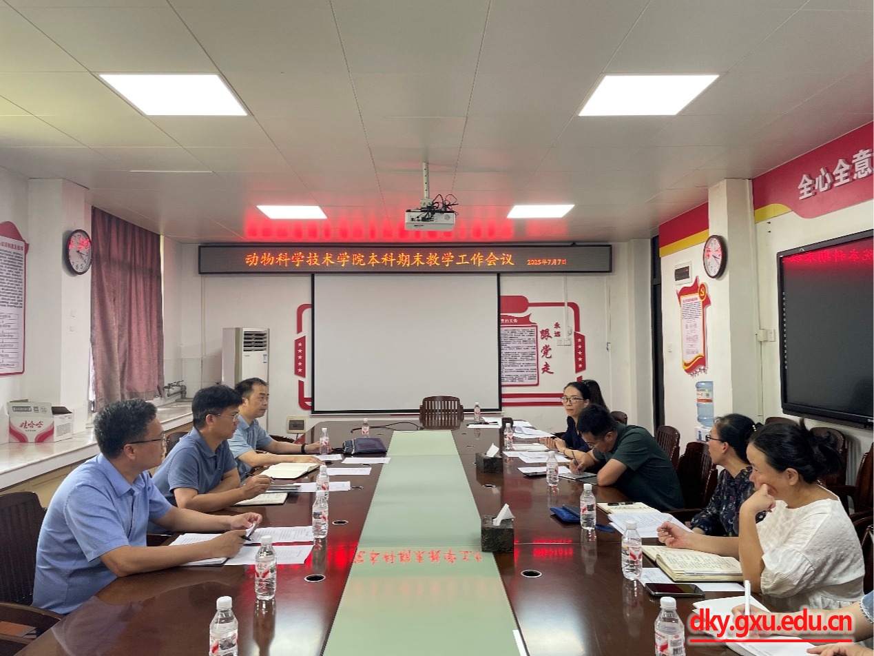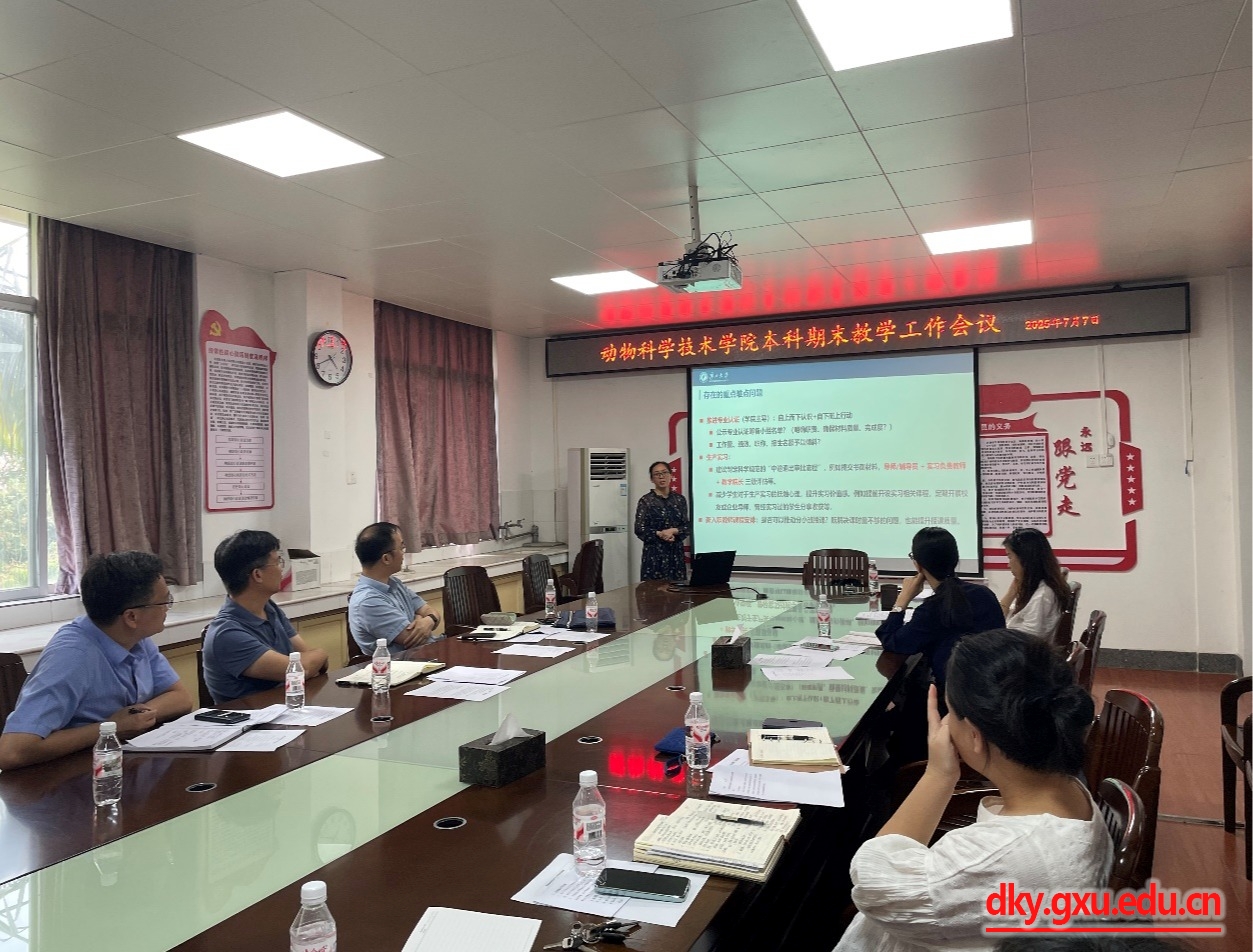 7月7日下午,2025年春季学期期末教学工作会议在院302会议室顺利召开。动物科学技术公司党委书记韦小强,经理陆阳清,副经理蒋钦杨,各基层教学组织负责人、学工组、教学办工作人员等参会。会议由蒋钦杨副经理主持,围绕本科教学核心工作展开深入研讨与部署。