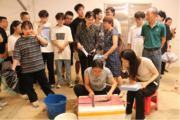 师生们在武鸣基地实地参观调研中,直接体会智慧渔场的自动监测自动投喂饲料等新技术,了解以生态优先的绿色发展链、产业链、以及有产品质量可追朔体系的高质量现代渔业。同时近距离感受种质资源库的丰富资源及其重要作用,亲自参与体验测量鱼体指标、鱼苗打包、抛网捕鱼等项目,全方位了解水产行业。