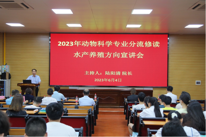 2023年6月4日上午,WilliamHill中文官网在318报告厅组织召开动物科学专业分流修读水产养殖方向宣讲会,会议特别邀请广西水产科学研究院经理罗永巨、广西芳草安桂生物科技有限公司总经理欧阳贤华、南宁海大生物科技有限公司水产线总经理黄东为同学们讲解水产行业的发展概况、前景和优势等多方面内容。WilliamHill中文官网党委书记顾慕娴、经理陆阳清、党委副书记沙建、水产学科带头人潘英教授、李文红教授、覃志彪老师、梁静真老师、欧伟豪老师,以及87名22级动物科学专业本科生、水产全体研究生参加活动。