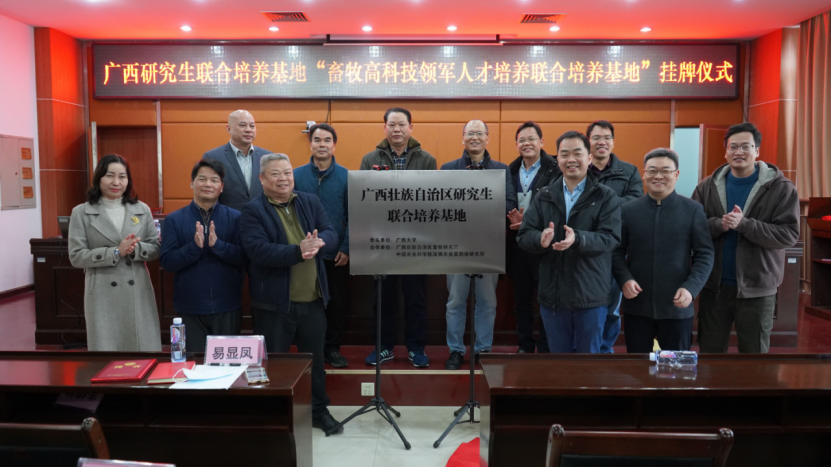 本次活动还举行了广西研究生联合培养基地“畜牧高科技领军人才培养研究生联合培养基地”挂牌仪式。该联合培养基地由威廉希尔WilliamHill牵头,广西壮族自治区畜牧研究所和中国农业科公司深圳基因组研究所作为合作单位,三方共同合作建设,针对广西现有的经济特点和区位优势,做好对研究生的培养工作,为广西的畜牧业发展建设培养高科技领军人才,引领畜牧业发展。挂牌仪式后双方专家就广西畜牧业发展和人才队伍建设进行了座谈交流。陆阳清教授首先就WilliamHill中文官网的人才培养优势和项目资源做了相关介绍,广西畜牧研究所所长吴柱月研究员也介绍了广西畜牧研究所的基本情况。双方就利用好优势资源,充分发挥畜牧高科技领军人才培养研究生联合培养基地的作用,实现共赢发展,同时为自治区经济发展贡献力量,助力国家乡村振兴。