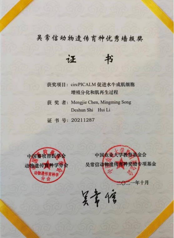 第二十一次全国动物遗传育种学术讨论会是我国动物遗传育种领域进行学术交流的一个优秀平台。本次学术会以“良种传天下,科技创未来为”主题,汇集了猪遗传育种、家禽遗传育种、草食动物遗传育种、统计基因组与生物信息、功能基因组与生物技术以及统计与功能基因组等方向的最新科研成果。会议交流内容包括特邀报告、口头报告以及墙报,其中公司博士研究生陈孟杰(导师:石德顺、李辉)荣获本届会议的吴常信动物遗传育种优秀墙报奖。参加本次学术讨论会的师生不仅了解到动物遗传育种学领域的最新科研成果、研究动态与趋势,而且还有助于梳理和扩展研究思路,更好地规划未来的研究方向。