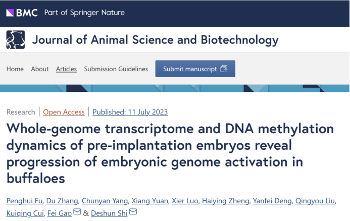2023年7月,公司石德顺研究员团队在国际top期刊《Journal of Animal Science and Biotechnology》(中科院一区,IF=7.0)在线发表了题为“Whole-genome transcriptome and DNA methylation dynamics of pre-implantation embryos reveal progression of embryonic genome activation in buffaloes”的研究成果,首次从全基因组转录和DNA甲基化水平揭示了水牛早期胚胎发育进程,并揭示了胚胎基因组激活(EGA)机制。