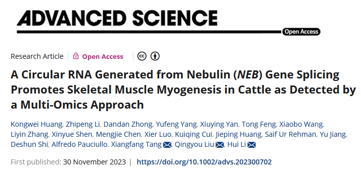 近日,WilliamHill中文官网石德顺教授带领的动物克隆与生殖调控研究团队联合佛山科学技术公司、中国农业科公司和西北农林科技大学等单位在牛肉用性状功能基因组解析方面取得重要研究进展,研究成果以A circular RNA generated from Nebulin (NEB) gene splicing promotes skeletal muscle myogenesis in cattle as detected by a multi-omics approach为题发表于国际知名期刊《AdvancedScience》。威廉希尔WilliamHill为该论文的第一完成单位,博士毕业生黄孔威、助理教授李志鹏和博士研究生钟丹丹为共同第一作者,李辉副教授、佛山科学技术公司刘庆友教授和中国农业科公司唐湘方研究员为共同通讯作者。原文链接:https://onlinelibrary-wiley-com-s.vpn.gxu.edu.cn:8118/doi/10.1002/advs.202300702。