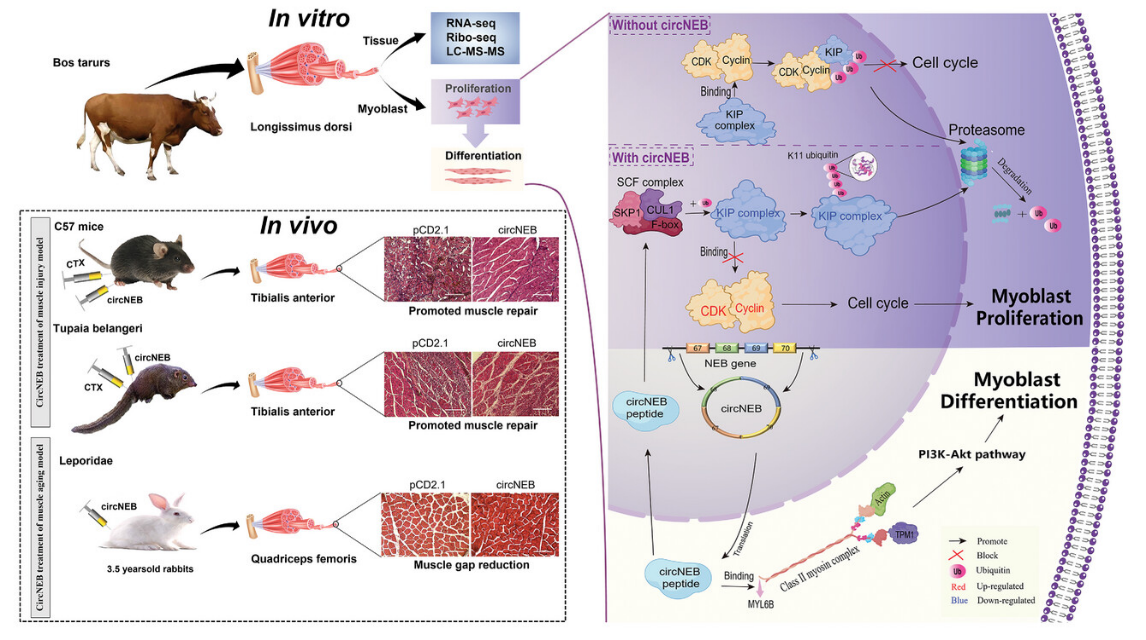 该研究整合牛RNA-seq、Ribo-seq和小肽组等多组学数据,构建了首个家畜非编码RNA编码图谱,结合功能研究发现,非编码RNAcircNEB可以编码一个含907个氨基酸的肌肉特异性肽,在体外可促进成肌细胞的增殖和分化,在体内可诱导肌肉再生。