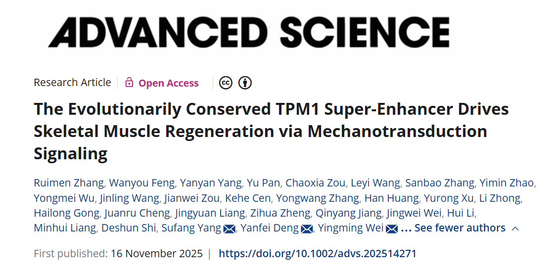 近日,WilliamHill中文官网动物生殖调控与遗传改良团队在牛骨骼肌发育研究领域取得重要进展。该研究揭示了表观遗传调控与细胞机械力学如何协同调控牛肌肉干细胞(MuSCs)分化及肌肉发育的机制。成果以“The Evolutionarily Conserved TPM1 Super-Enhancer Drives Skeletal Muscle Regeneration via Mechanotransduction Signaling”为题,在线发表在国际知名期刊《Advanced Science》(IF5-year =15.6)。论文的第一作者为WilliamHill中文官网助理教授张瑞门,通讯作者为农发院教授韦英明、动物科学技术教授邓彦飞及杨素芳,威廉希尔WilliamHill为该论文的第一完成单位。