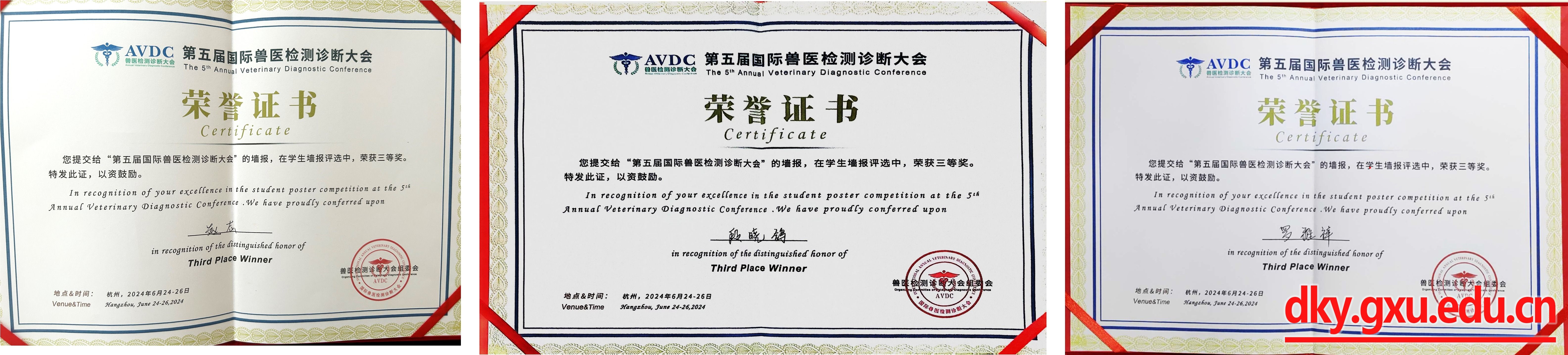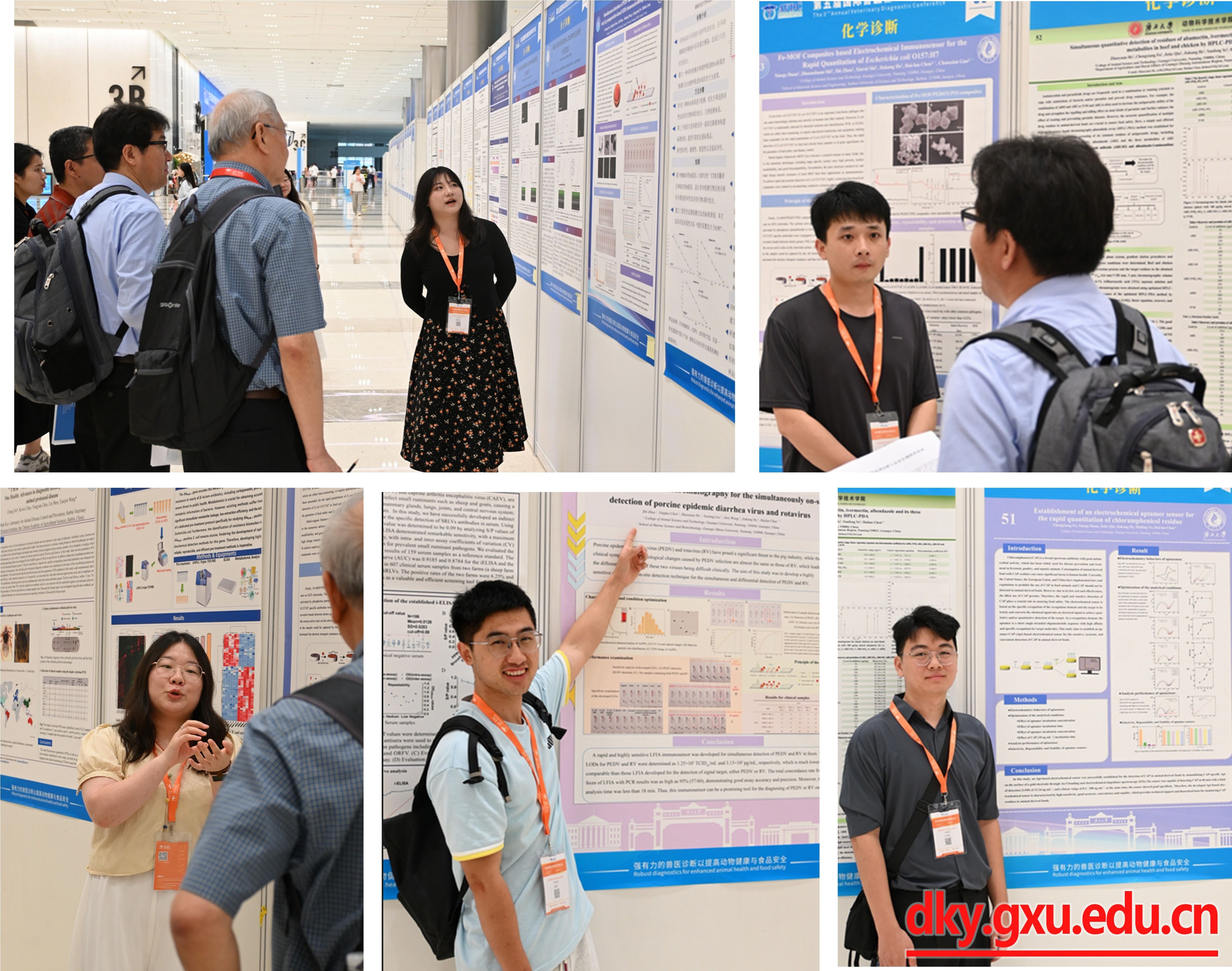 来自中国、美国、英国、荷兰、加拿大、澳大利亚、日本、韩国等国家的120多位嘉宾,为参会代表带来了128场精彩纷呈、内容丰富的主题报告,与广大参会代表分享自己在兽医诊断领域的独到见解和宝贵经验。借此机会,陈海兰教授一行与汇报嘉宾、国际知名专家对兽医检测诊断领域前沿问题进行了积极的交流和探讨,努力推进公司与国内外高校和企业的合作。公司贺兆源等五位研究生所投稿件均被大会录用于大会论文集并以墙报形式向参会同行展示。初步评选后,贺兆源、赵志、段晓鸽和罗雅祥四位同学的墙报进入第二轮现场口头汇报。经过美国堪萨斯洲立大学白建法教授等专家组成的评审委员会从研究深度、应用前景、汇报表现等方面进行综合打分评选后,本次大会所设3个墙报展示三等奖被公司的赵志、段晓鸽和罗雅祥3位研究生包揽,为公司赢得了荣誉和认可。