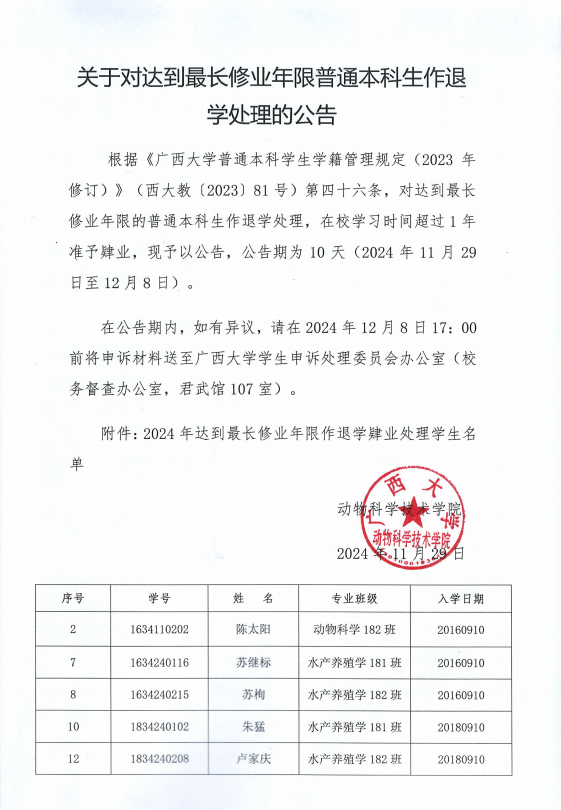 关于对达到最长修业年限普通本科生作退学处理的公告
