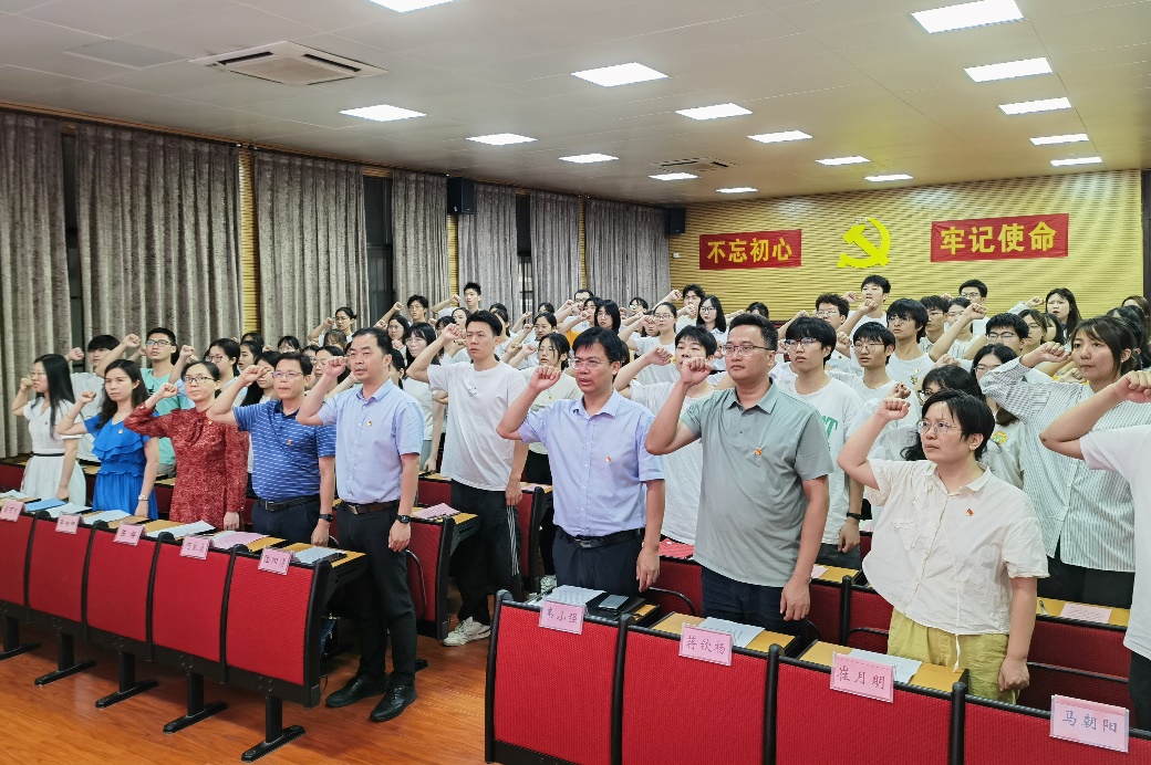 On the occasion of the 103rd anniversary of the founding of the CPC, in order to further encourage and guide Party members and comrades to keep their original intentions in mind, keep their mission in mind, continue their struggle and forge ahead, the School of Animal Science and Technology of Guangxi University held a preparatory party member oath ceremony in the 318 lecture hall on the afternoon of July 1. Wei Xiaoqiang, Secretary of the Party Committee of the College of Animal Science and Technology, Lu Yangqing, Deputy Secretary of the Party Committee and Dean, Ning Pengfei, He Jiakang, Jiang Qinyang, members of the Party Committee and Vice Dean, Chen Ying, member of the Discipline Inspection Commission and Director of the Department of Animal Medicine, as well as all counselors attended the ceremony. Sha Jian, Deputy Secretary of the Party Committee of the College of Animal Science and Technology, presided over the ceremony.
